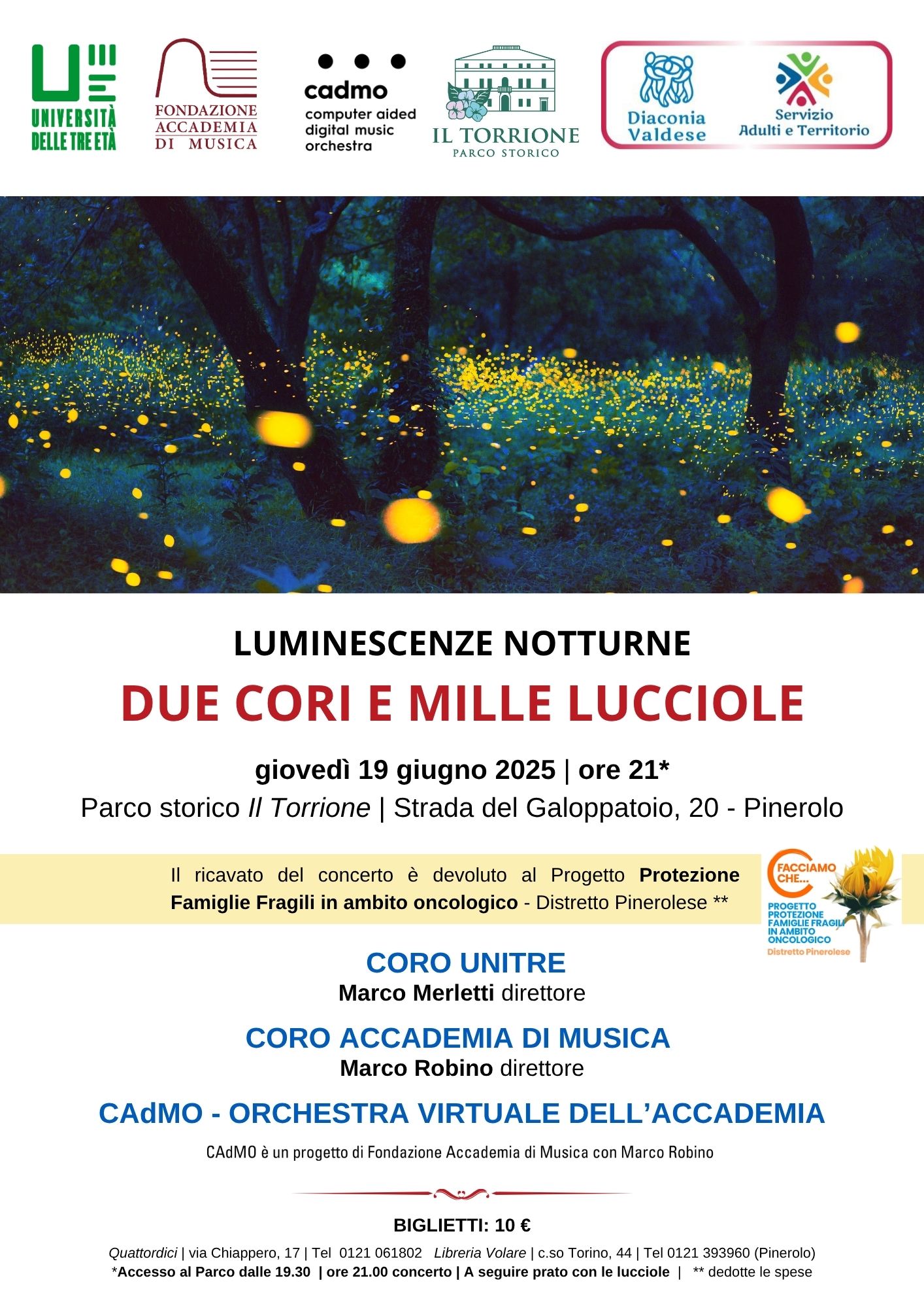 Il Coro Unitre di Pinerolo diretto da Marco Merletti e il Coro Accademia di Musica diretto da Marco Robino con l’accompagnamento di CAdMO – Orchestra Virtuale si esibiscono insieme in occasione del concerto Due cori e mille lucciole per raccogliere fondi per il Progetto Protezione Famiglie Fragili in ambito oncologico – Distretto Pinerolese (dedotte le spese). L’accesso al Parco storico Il Torrione è possibile a partire dalle 19.30, alle 21.00 inizia il concerto. A seguire sarà possibile godersi lo spettacolo delle lucciole. I biglietti sono acquistabili a Pinerolo presso Quattordici (via Chiappero, 17) o presso la Libreria Volare (c.so Torino, 44) al costo di 10€.