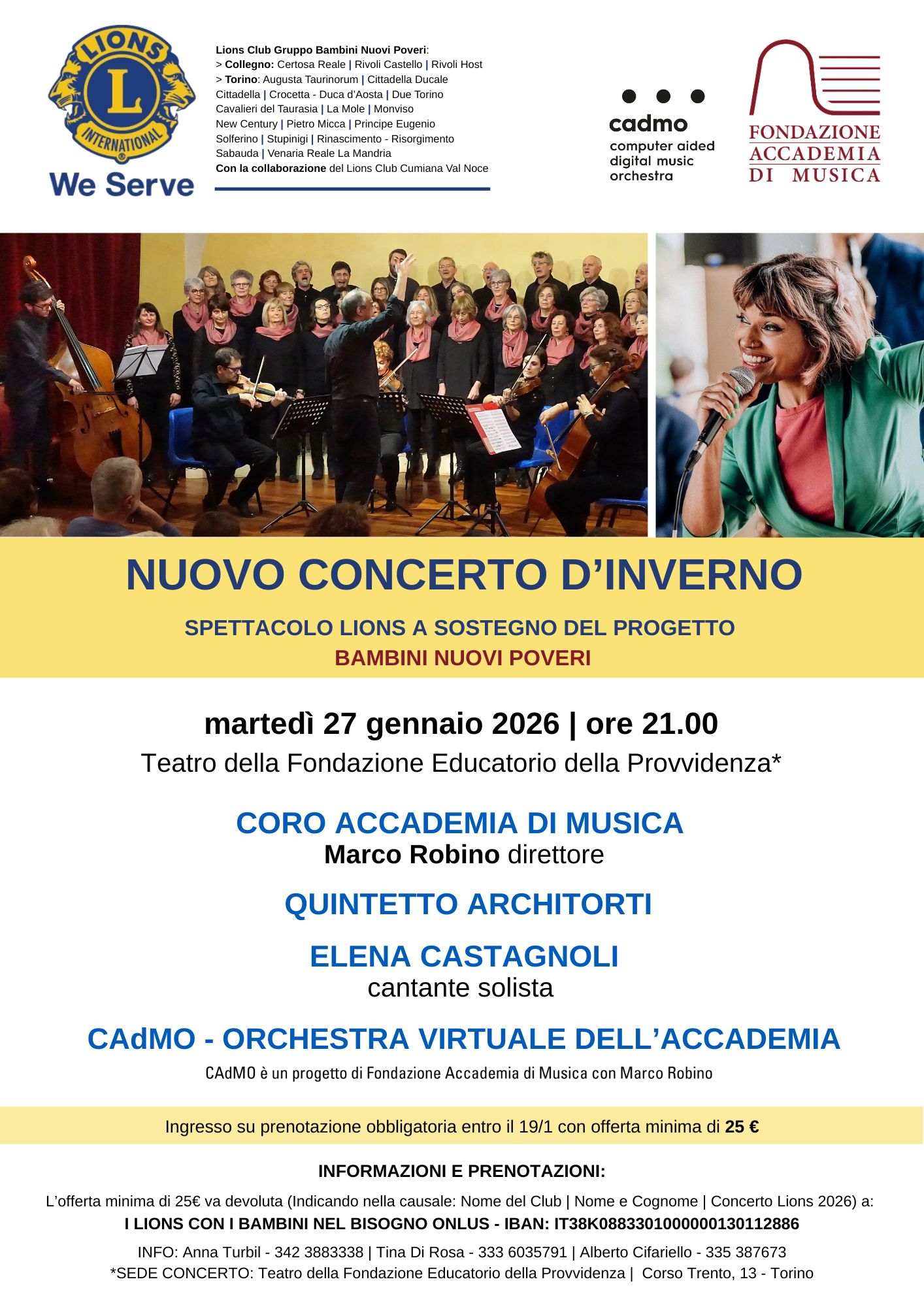 L’offerta minima di 25€ va devoluta (Indicando nella causale: Nome del Club | Nome e Cognome | Concerto Lions 2026) a: