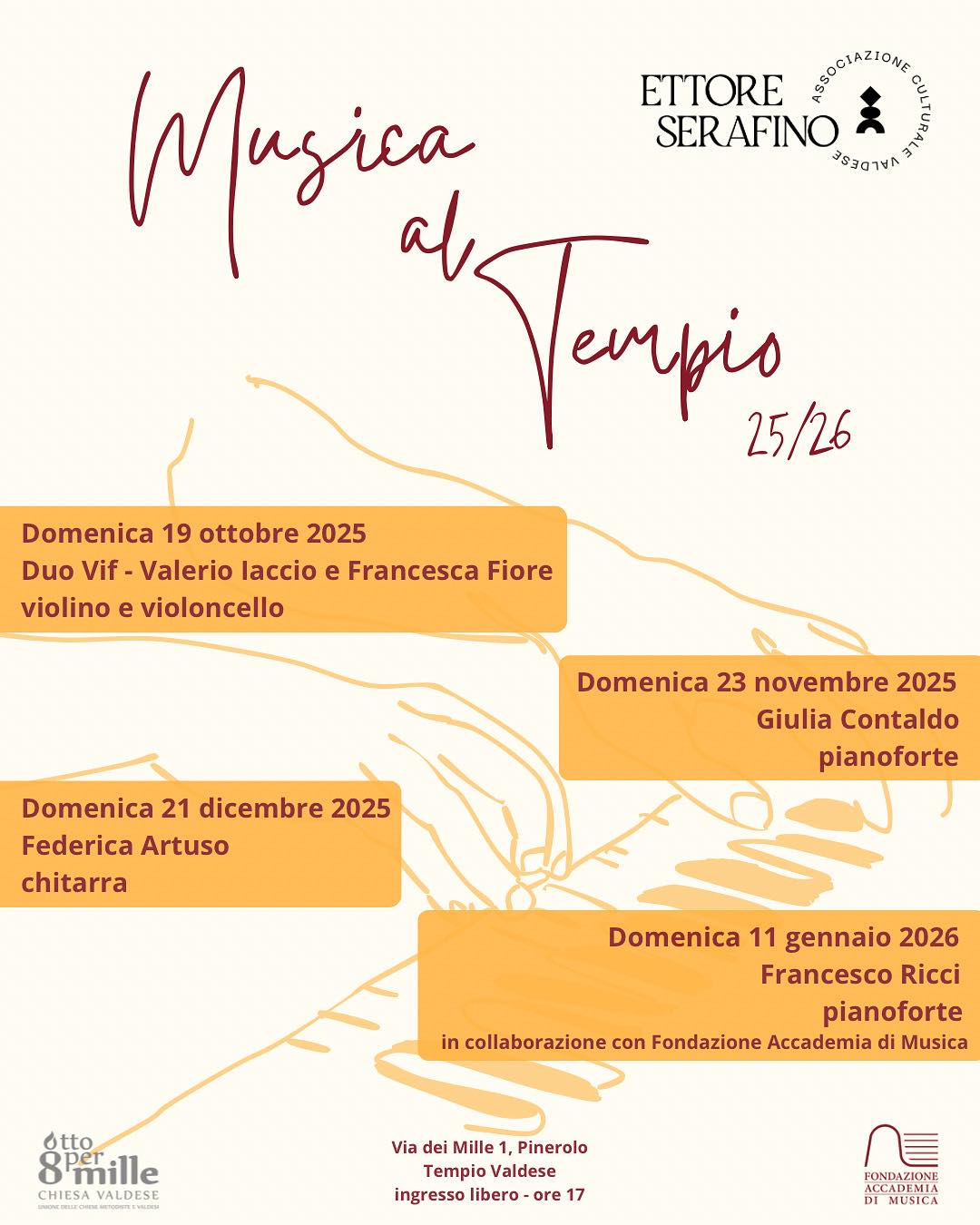I concerti di Musica al Tempio si tengono presso il Tempio Valdese di Pinerolo (Via dei Mille 1). Il primo concerto è previsto domenica 11 gennaio 2026 alle ore 17 e vede protagonista Francesco Ricci, allievo dei corsi di perfezionamento di Roberto Plano e di Filippo Gamba dell’Accademia di Musica. Il secondo concerto si terrà nella seconda metà del cartellone. L’ingresso a entrambi i concerti è libero.